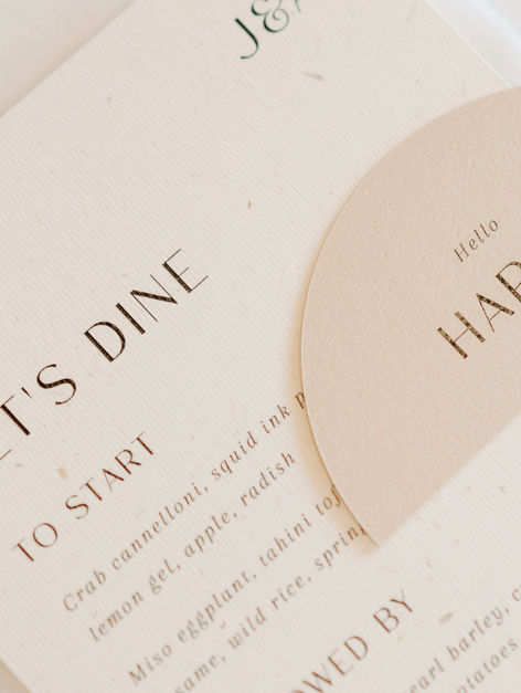 If you like refined, modern, minimalist styling with luxe finishes and textures, our stationary is made for you. Our range includes 3 piece invitation sets, and on-the-day stationary including menus, place cards, welcome signs and favour tags. Fully customise by choosing your card stock colour, texture and shape to suit your event theme.